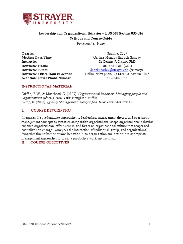 Bus 520 Organizational Behavior Strayer University 2010 Custom